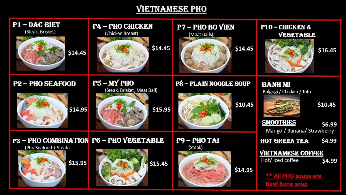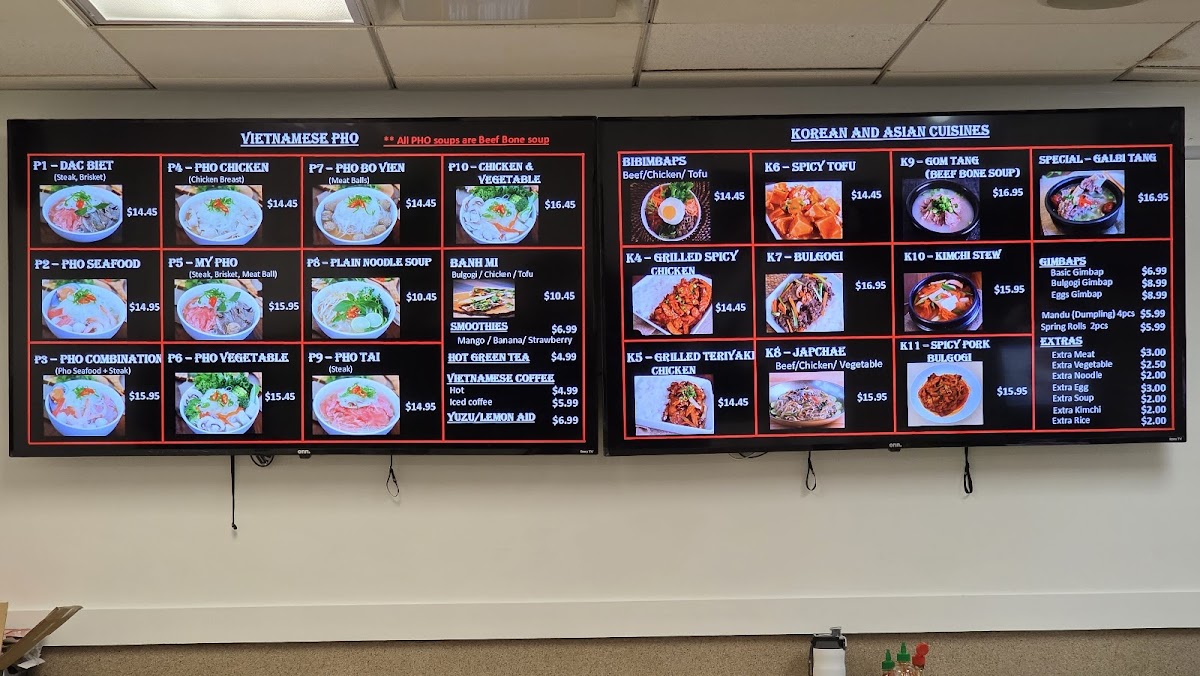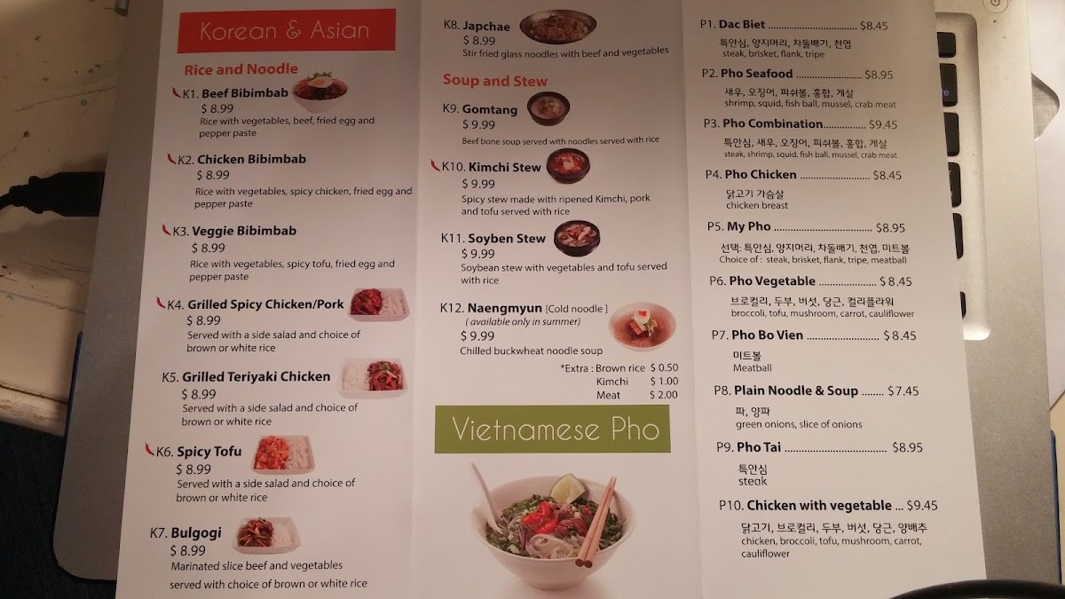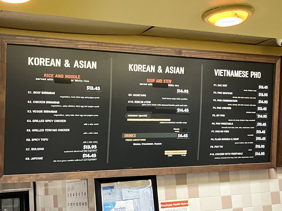 As someone wrapping up a full look at the menu, I find that Green Apple Phoever delivers a well-balanced and satisfying selection that reflects both Vietnamese comfort food and Korean-Asian favorites. The Specials immediately set the tone, with hearty and flavorful choices like Galbi-Tang, Bulgogi Ban Mi, and Spicy Pork Bulgogi, all of which highlight bold marinades and slow-cooked depth that feel perfect for a food court setting without sacrificing authenticity. Moving into the Vietnamese classics, the Vietnamese Pho section is clearly the heart of the menu. Options such as P1. Dac Biet, P2. Pho Seafood, P3. Pho Combination, P4. Pho Chicken, and P5. My Pho offer something for every preference, from rich beef-based broths to lighter chicken and seafood variations, making pho lovers feel truly catered to. The menu then expands confidently into Korean and Asian dishes, adding variety and warmth with items like K1. Beef Bibimbab, K4. Grilled Spicy Chicken, K5. Grilled Teriyaki Chicken, K6. Mapo Tofu, and K7. Bulgogi. These dishes round out the experience with rice bowls, grilled proteins, and savory sauces that complement the pho rather than compete with it. Overall, the menu feels thoughtfully curated, offering familiarity without being repetitive and variety without being overwhelming. As a conclusion to everything presented, Green Apple Phoever’s menu stands out for its clear structure, comforting flavors, and cross-Asian appeal, making it a reliable and enjoyable choice for anyone looking for a satisfying meal in the heart of downtown Chicago.